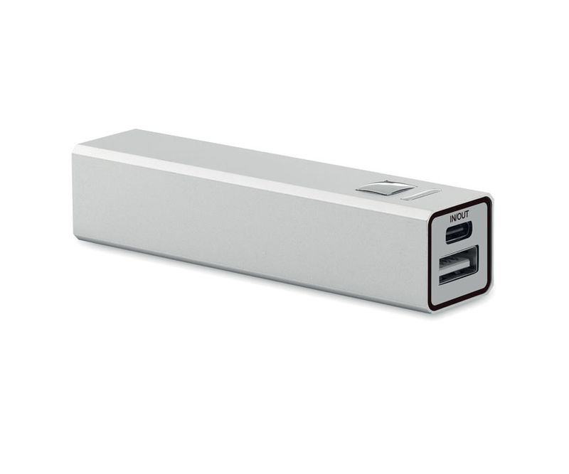 Power bank de 2600 mAh in carcasa din aluminiu reciclat. Capacitate de utilizare pentru smartphone, curent de iesire DC5V/1A. Inclusiv cablu de incarcare USB Type-C cu adaptor Type-A. Intrare/iesire: USB Type-C.