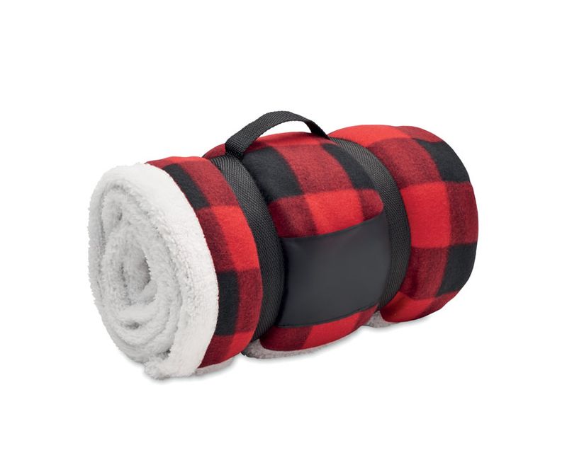 Patura din fleece captusita cu sherpa din 1RPET fleece polar (180 gr/m²) si poliester sherpa ( 230 gr/m² ). Prezentata cu maner de transport din nailon RPET.
