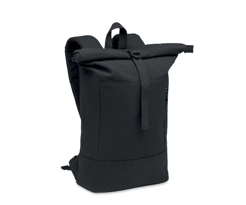 Rucsac cu fermoar pentru laptop 15 inch, cu fermoar, din bumbac reciclat si poliester reciclat (70%/30%). Buzunar frontal cu fermoar. Spate si curele de umar captusite. 340gr/m².