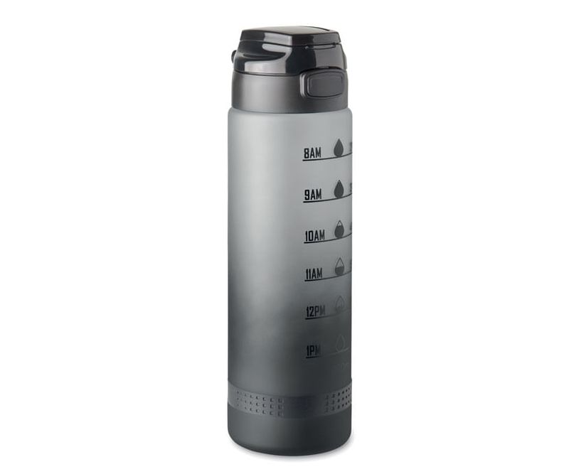 Sticla de apa sport din RPET, marcaj de timp motivational, capac flip top deschidere cu o singura mana, blocare de siguranta si curea de transport. Capacitate: 1L.