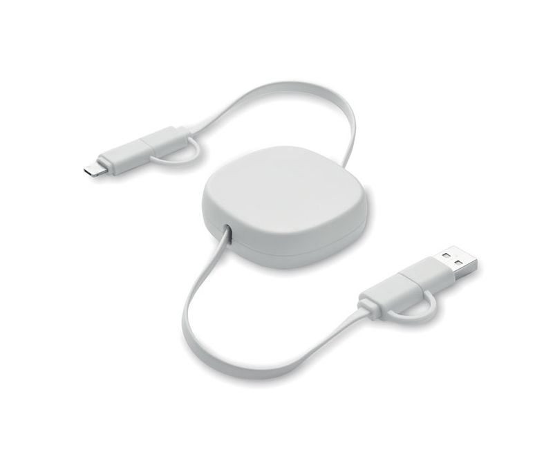 Cablu retractabil de 60W in carcasa din ABS reciclat. Intrare: 2 in 1 Type-C si Type-A. Iesire: Tip-C si micro-B (2 in 1 pin). Lungimea cablului: 80 cm.