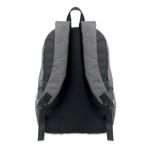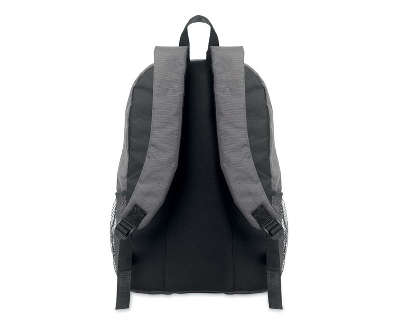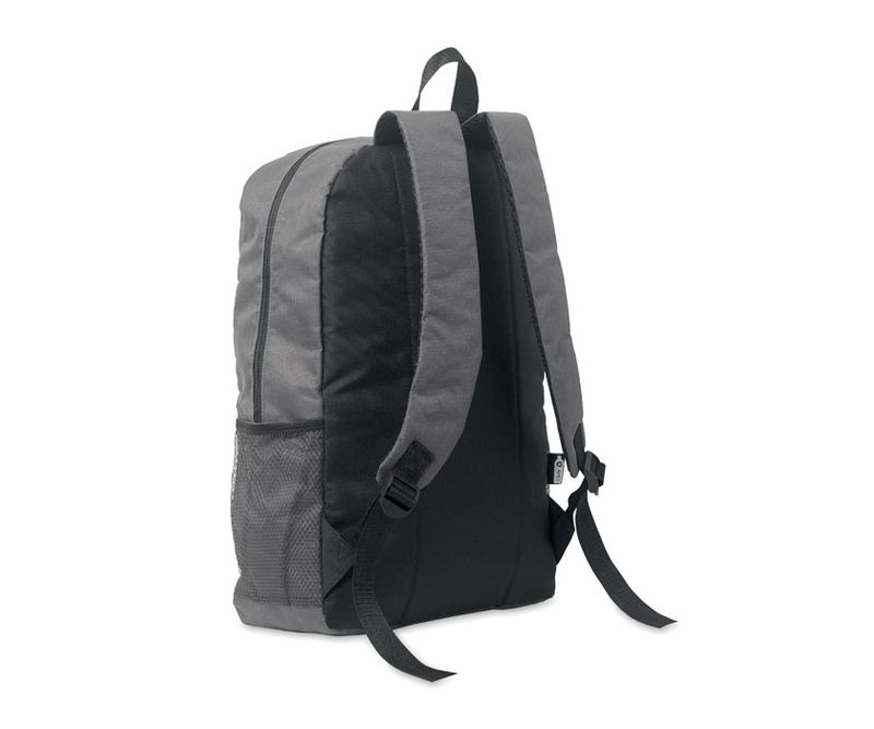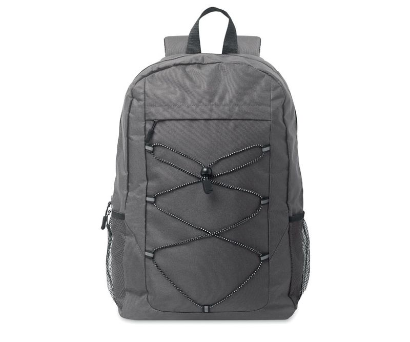 Rucsac din poliester 600D RPET cu cordon decorativ si panou frontal cu fermoar pentru buzunare. Buzunare din plasa pe ambele parti.