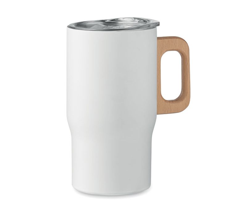 Pahar tumbler cu perete dublu din otel inoxidabil reciclat (90% otel inoxidabil reciclat si 10% otel inoxidabil) cu maner din lemn. Capacitate: 350 ml.