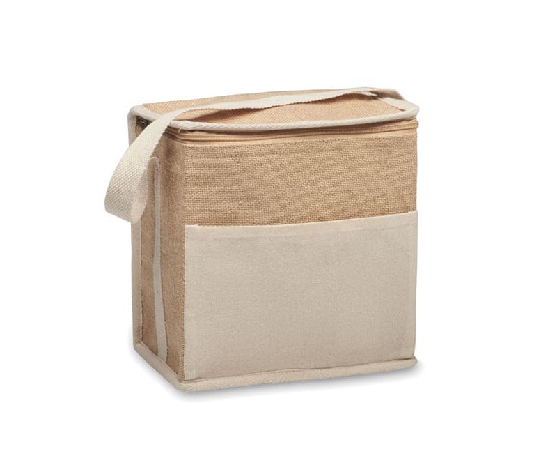 Geanta frigorifica din iuta cu curea din bumbac si buzunar frontal pentru sticle de 6x0,5 L. Material de izolare: folie de aluminiu de 3 mm. Capacitate 3L.