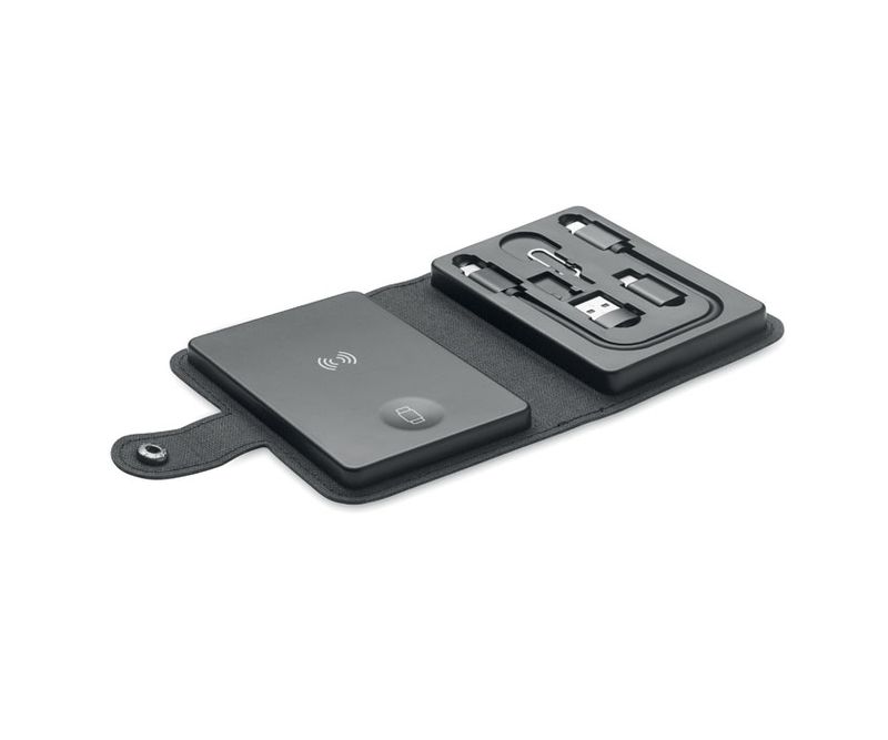 Set conector cablu cu incarcator wireless 15W si incarcator ceas (numai Apple®). Cablu de incarcare 4 in 1 cu unealta cu pin ejector. Capac din PU reciclat en RPET, materiale plastice din ABS reciclat si placa din aluminiu reciclat.