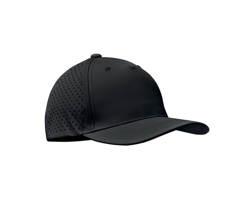 Sapca performanta din poliester cu 5 panele, inchidere reglabila cu carlig si bucla si gauri perforate cu laser cu 2 ochiuri cusute in culori asortate. Articolul se usuca rapid, respinge transpiratia si apa. 130 gr/m².