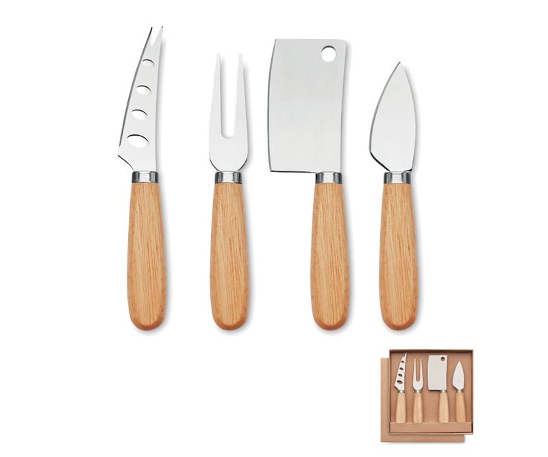 Set de 3 cutite de servire a branzei si 1 furculita din otel inoxidabil, cu maner din lemn de cauciuc.