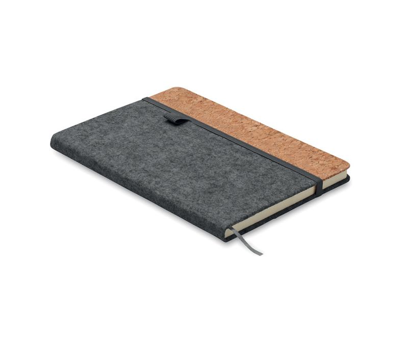 Caiet A5 cu coperta din pasla RPET si pluta. 160 de pagini liniate din hartie reciclata (80 de coli). Bucsa elastica pentru stilou pe partea din fata, curea de inchidere elastica asortata si panglica de marcare a paginilor.