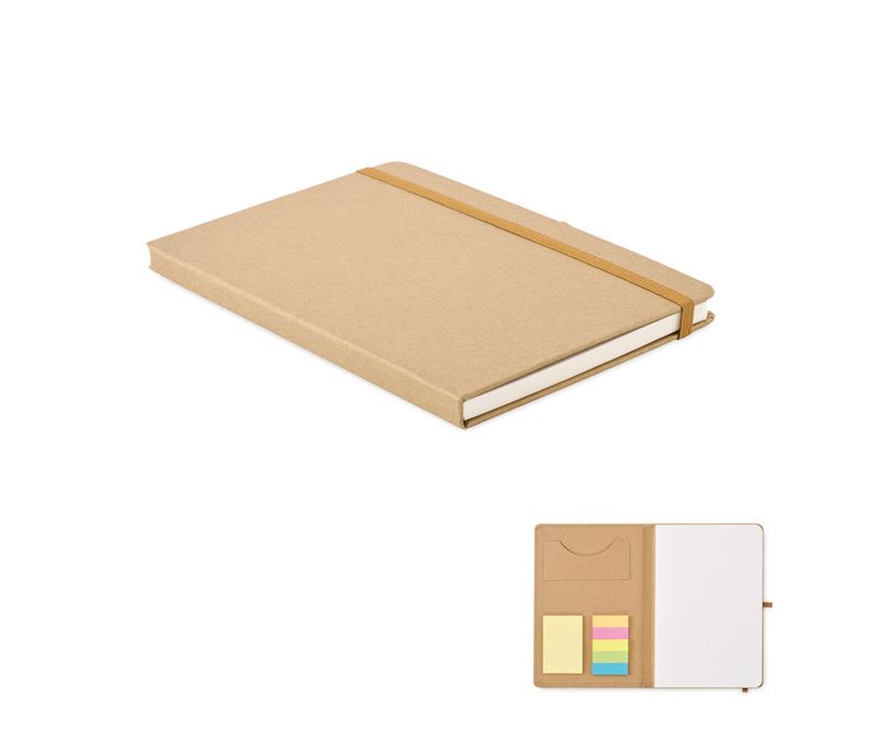 Caiet A5 cu coperta din carton cu 80 de coli de hartie reciclata (160 de pagini) 25 de coli de notite adezive si 25 de memo-uri. Curea de inchidere elastica si suport pentru pixuri.