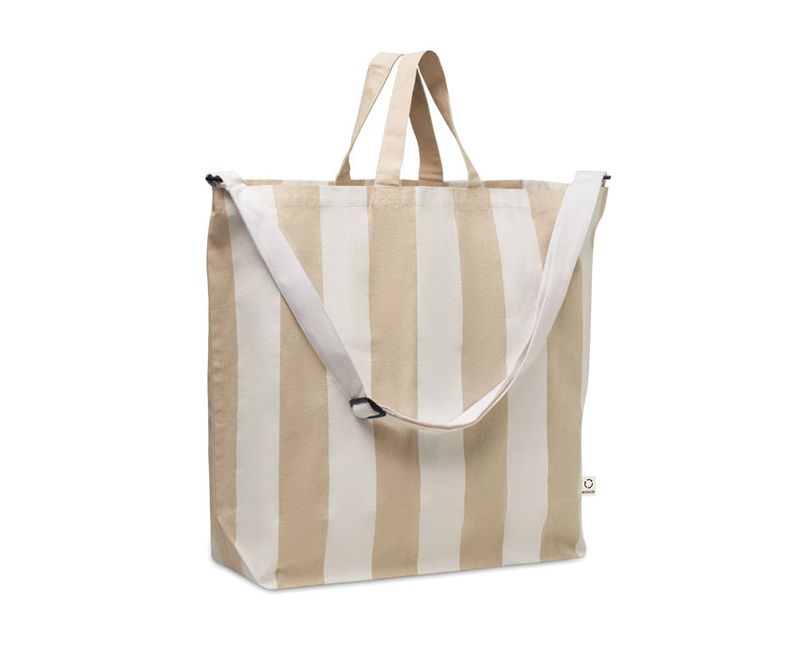 Geanta de plaja foarte mare cu dungi din bumbac reciclat (80%) si poliester reciclat (20%) de 280 gr/m², cu buzunar interior. Manere scurte si o curea de umar mare reglabila.