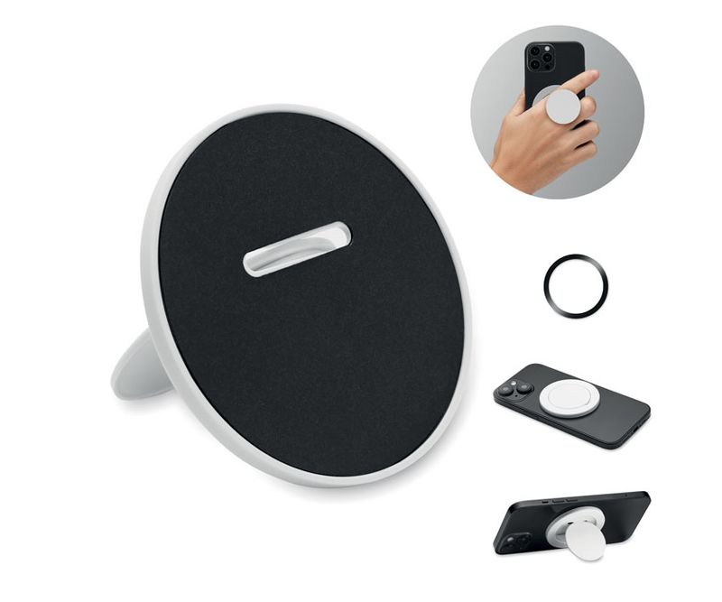 Suport magnetic pentru telefon si suport din ABS reciclat. Include inel metalic suplimentar pentru a sustine telefoanele nemagnetice.