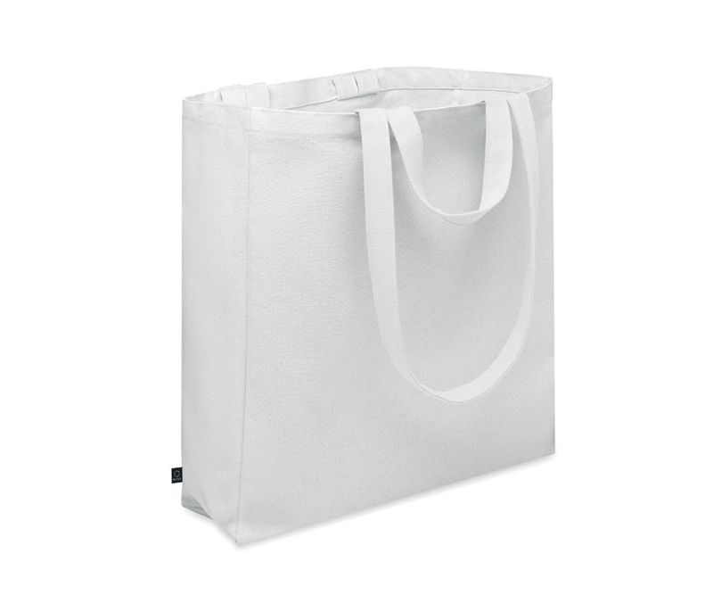 Sacosa de cumparaturi sau de plaja din polycotton reciclat (70% bumbac reciclat, 30% poliester reciclat) cu manere scurte. Buzunar lateral cu fermoar 380 gr/m².