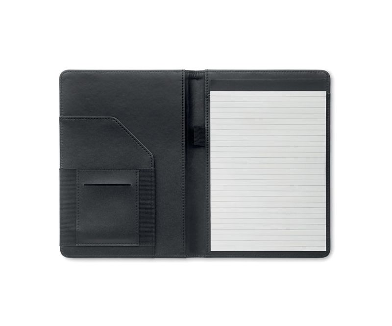 Portofoliu A5 din RPET 300D in 2 tonuri. Blocnotes A5 inlocuibil. 40 de pagini din hartie de bambus alba captusita (20 de foi). Suport pentru pixuri. Suporturi pentru carduri pe partea interioara si un compartiment mare.