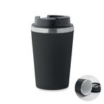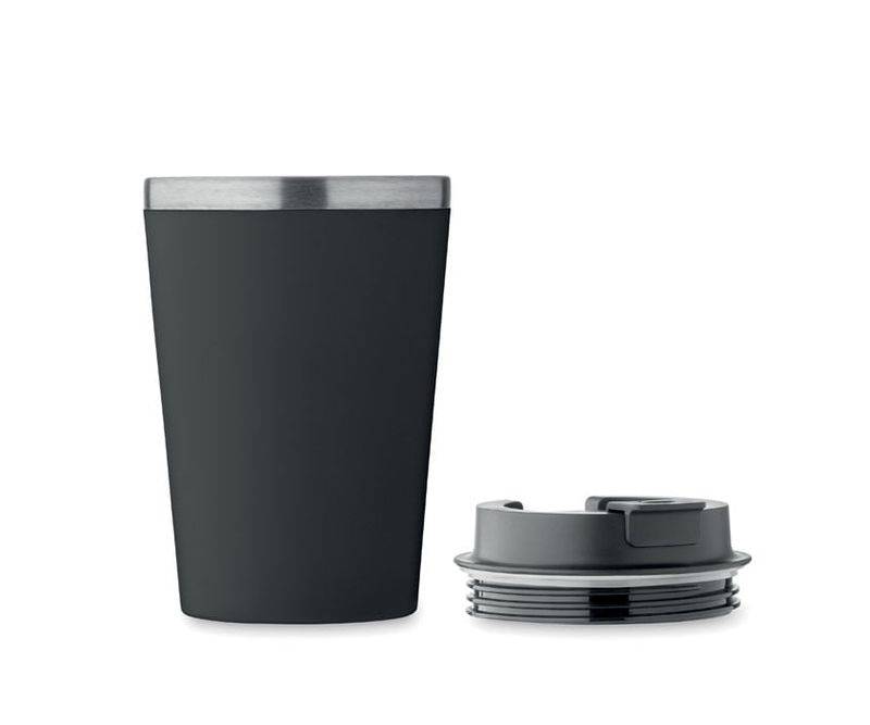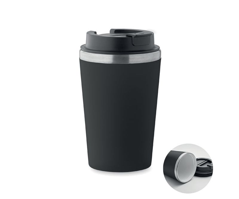 Pahar dublu cu perete exterior din PP si perete interior din otel inoxidabil reciclat (90% otel inoxidabil reciclat si 10% otel inoxidabil) cu o captuseala interioara din ceramica. Fara scurgeri. Capacitate: 350 ml.