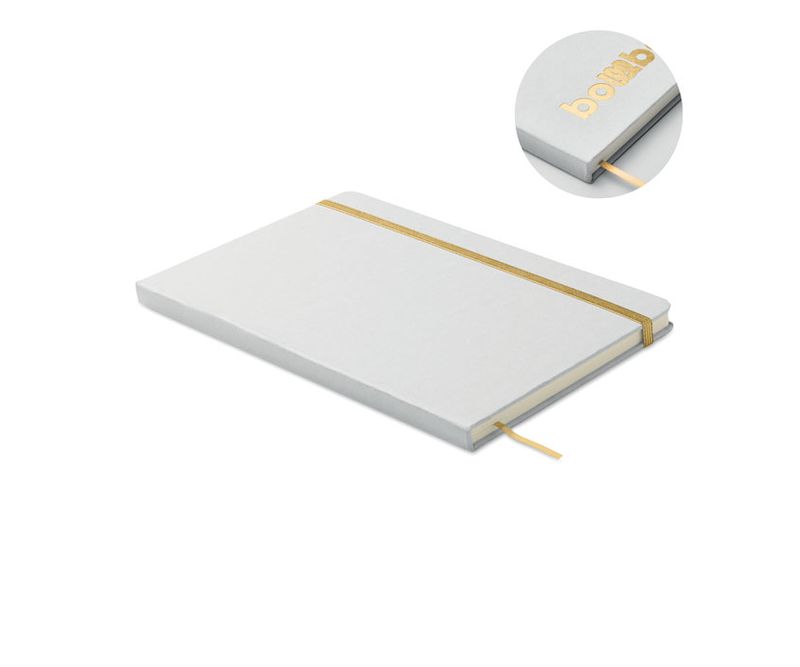 Notes A5 cu coperta tare din carton reciclat. Coperta neagra. Legat cu carcasa. 160 de pagini liniate din hartie reciclata (80 de coli). Curea de inchidere elastica, semn de carte cu panglica asortat cu culoarea dezvaluita. Dupa gravarea cu laser, culoarea este dezvaluita.