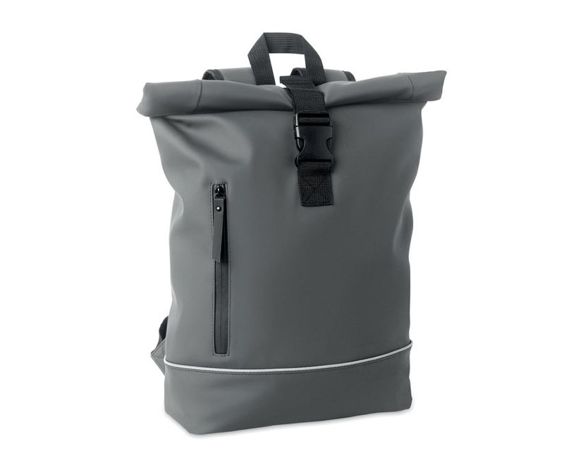 Rucsac pentru laptop rolltop de 15 inch din PU moale cu spate captusit si baza intarita cu banda reflectorizanta. Buzunar frontal cu fermoar impermeabil. Captuseala din poliester RPET 210D.