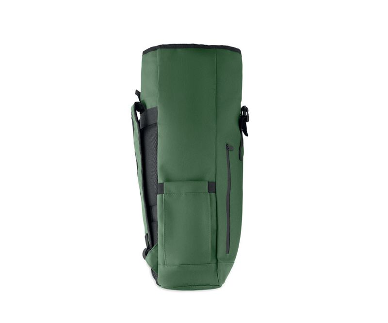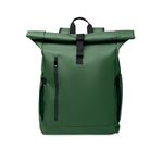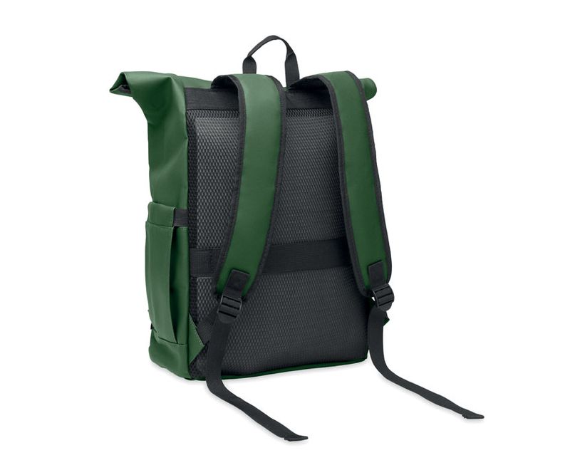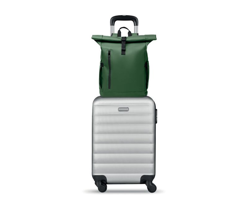 Rucsac rolltop pentru laptop 15 inch din poliester 600D RPET acoperit cu PU si captuseala din poliester RPET. Spate captusit cu ochiuri, cu buzunar cu fermoar si curea pentru troller. Curea de umar captusita cu finisaj interior din plasa.