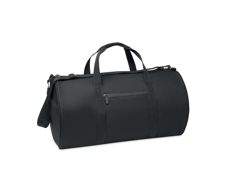 Geanta duffle din poliester 600D RPET cu strat PU. Buzunar frontal cu fermoar. Captuseala interioara din poliester RPET 210D. 1 compartiment lateral cu fermoar / 1 compartiment lateral cu plasa. Buzunar cu fermoar in interior.