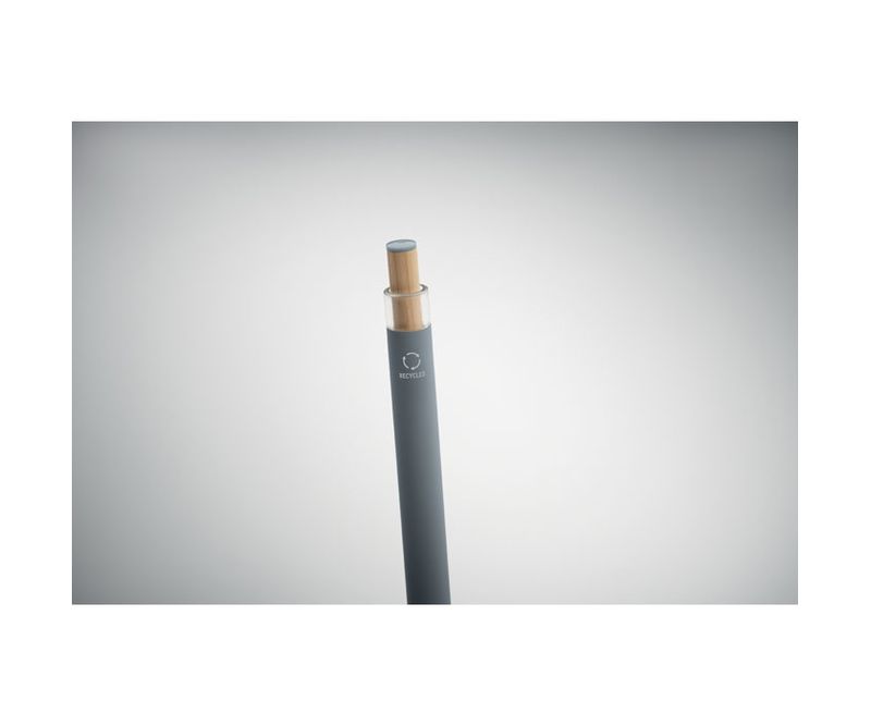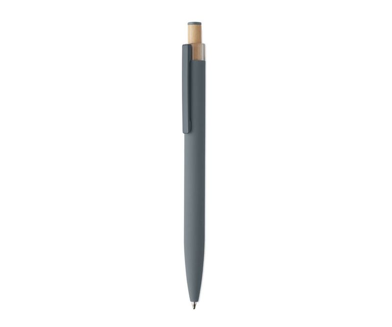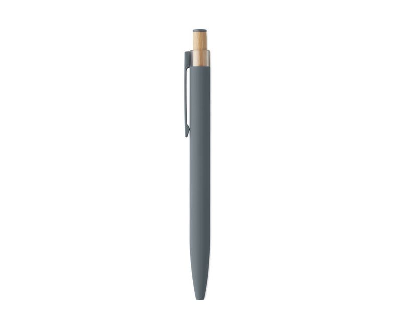 Pix cu bila din aluminiu reciclat, cu buton din bambus si detalii in aceeasi culoare, clip metalic asortat. Mina albastra.