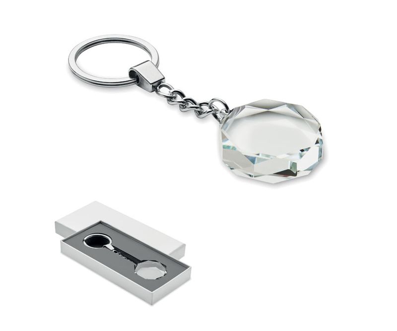 Breloc rotund de sticla trofeu. Prezentat intr-o cutie cadou.
