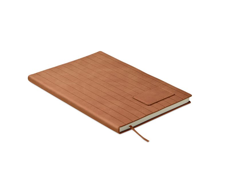 Caiet A5 cu coperta moale cu nervuri fumurii PU din 40% reciclat post consum si 60% PU cu petic simplu PU. 160 de pagini liniate, hartie reciclata de 70 gsm (80 de coli). Semn de carte cu panglica din poliester de aceeasi culoare.