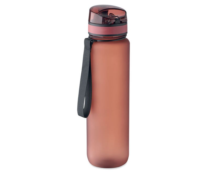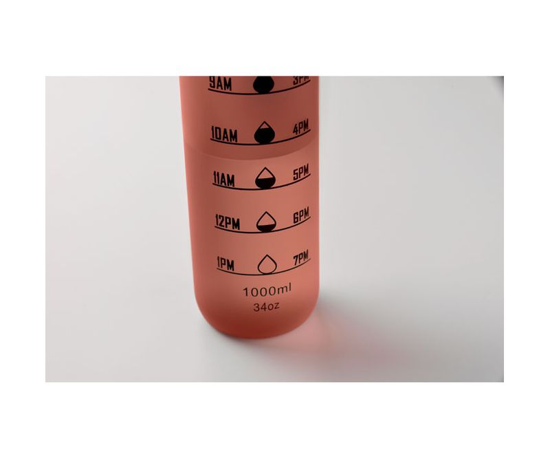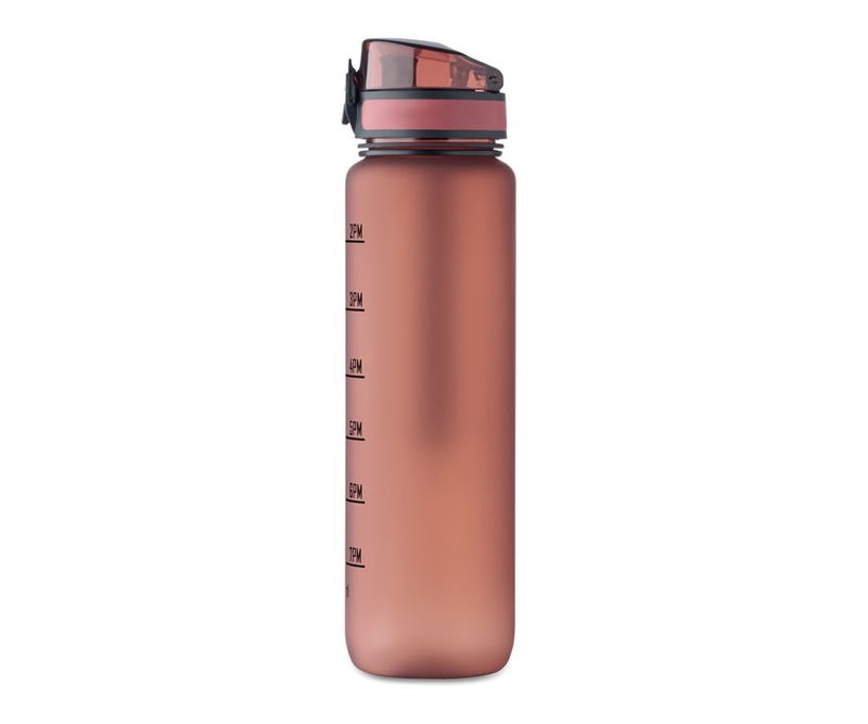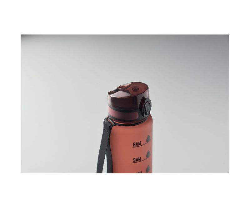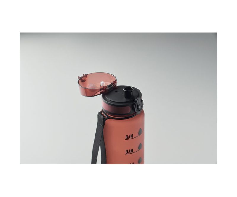 Sticla de apa sport din RPET, marcaje de timp motivationale, capac flip top cu deschidere cu o singura mana, blocare de siguranta si curea de transport. Fara scurgeri. Capacitate: 1L.