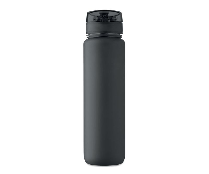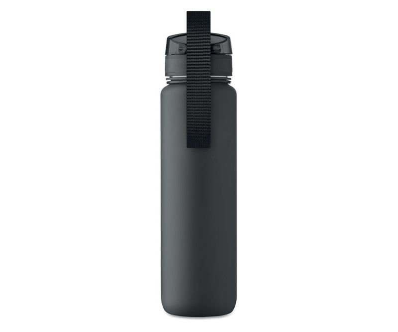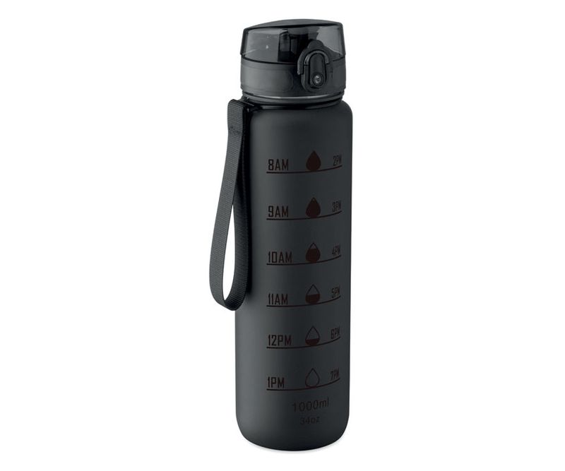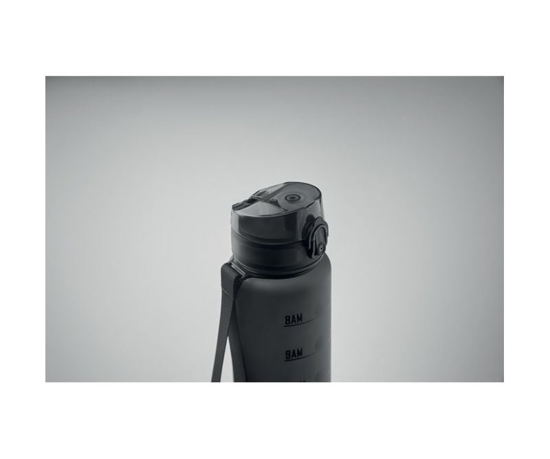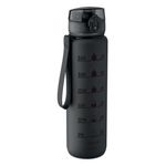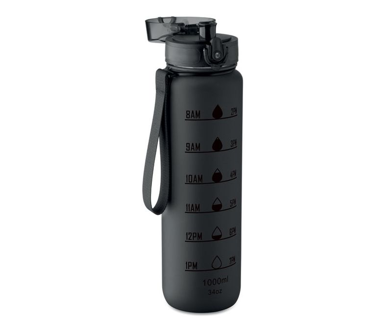 Sticla de apa sport din RPET, marcaje de timp motivationale, capac flip top cu deschidere cu o singura mana, blocare de siguranta si curea de transport. Fara scurgeri. Capacitate: 1L.