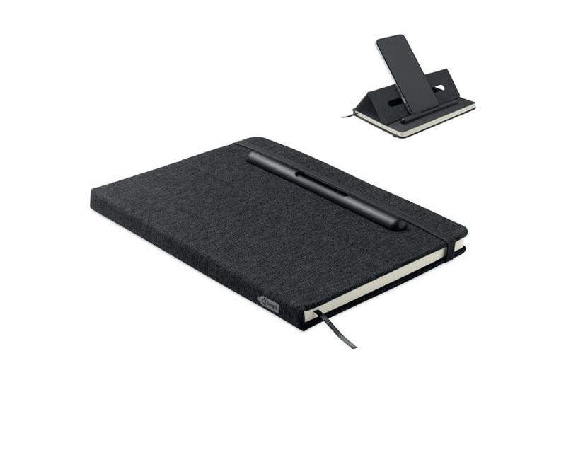 Notebook A5 cu coperta rigida RPET cu functionalitate de suport pentru telefon. Pix integrat 2 in 1 fara cerneala si obisnuit din ABS. Bloc cusut. 192 de pagini liniate din hartie reciclata (96 de coli). Curea si semn de carte asortate.