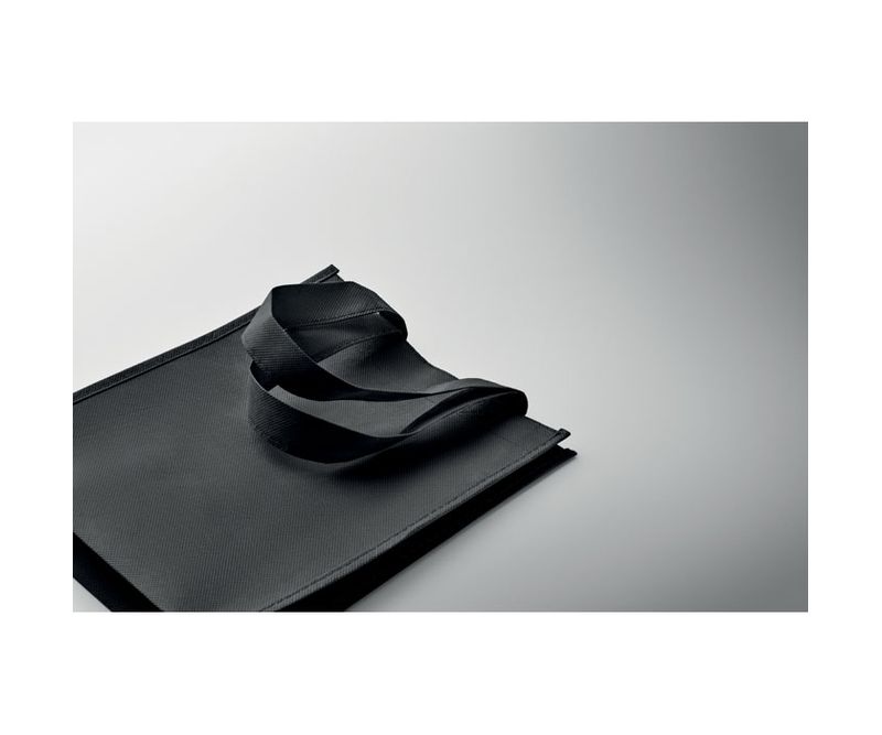 Punga mica pentru cadouri sau bunatati din RPET netesut cu manere scurte si burdufuri inferioare. 80 gr/m².