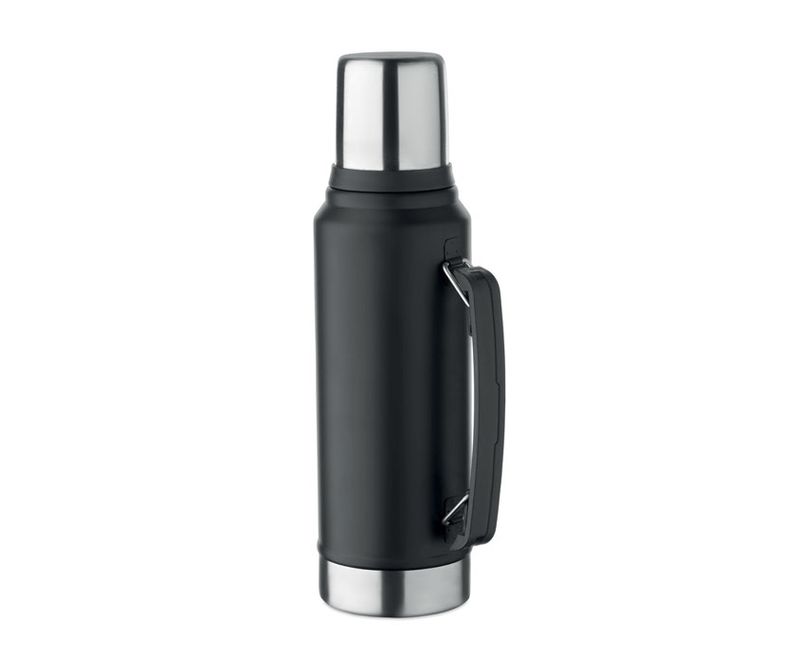 Sticla termoizolanta cu perete dublu din otel inoxidabil reciclat ( (90% otel inoxidabil reciclat si 10% otel inoxidabil) cu maner pe lateral. Capac din PP si pahar din otel inoxidabil reciclat. Fara scurgeri. Capacitate: 1L.