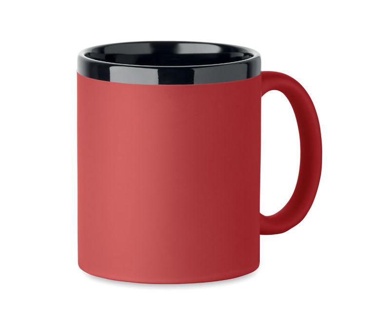 Cana din ceramica cu invelis moale la atingere si interior/ margine negru. Pentru gravura laser. Capacitate: 300 ml. Ambalata individual in cutie de carton alba.