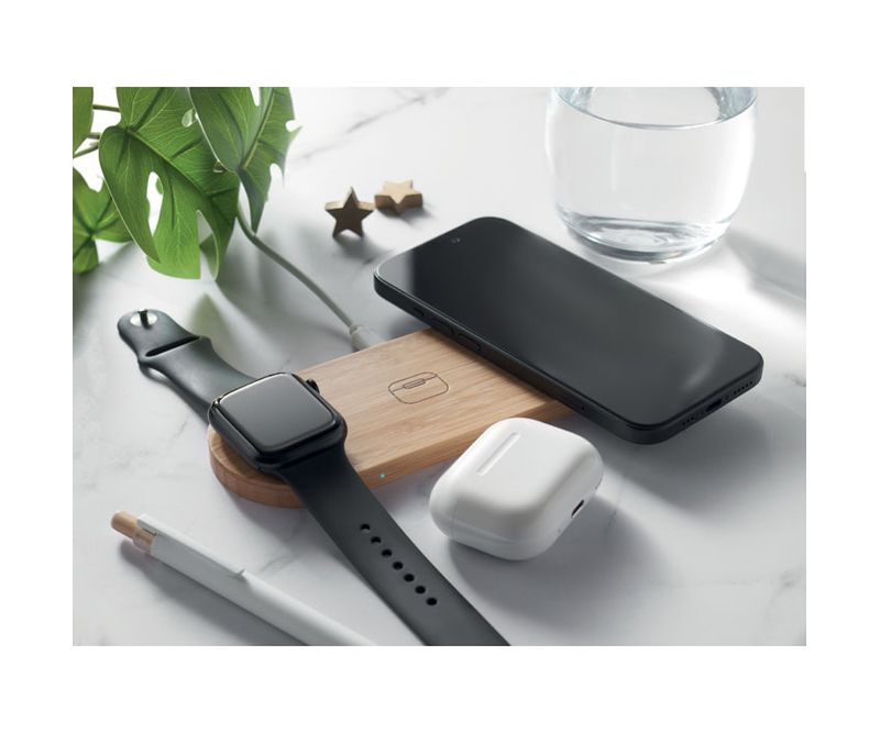 Statie de incarcare 3 in 1 in carcasa de bambus. Acesta include un incarcator wireless de 15W, incarcator pentru smartwatch (numai Apple®) si incarcator TWS.