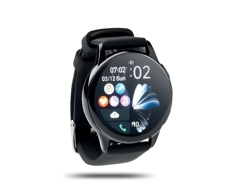Ceas inteligent wireless rezistent la apa IP68 din aliaj de zinc cu curea din silicon. Ecran tactil AMOLED de 32 inch. Baterie reincarcabila Li-Pol de 300 mAh. Necesita o aplicatie gratuita (FitCloudPro disponibila in iOS si Android).