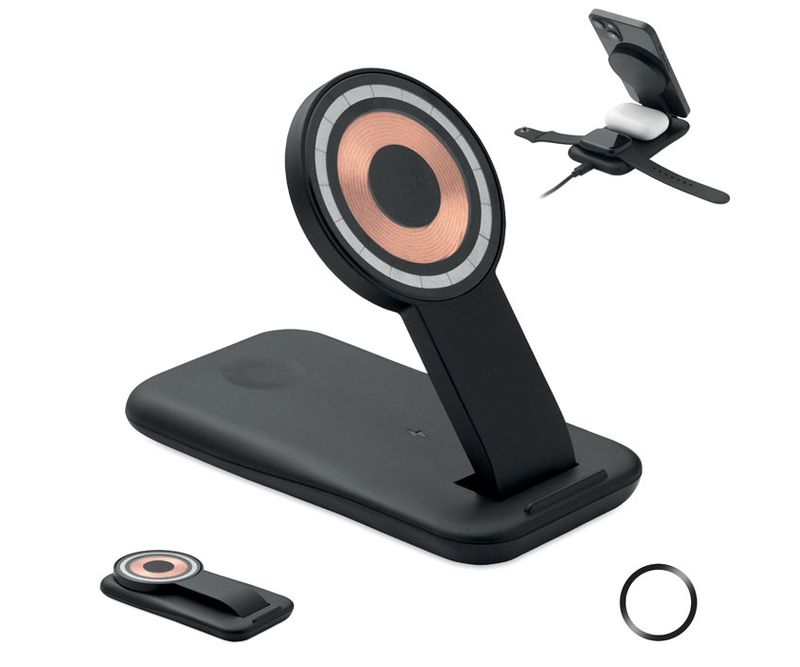 Incarcator 3 in ABS. Include incarcator wireless magnetic 15W cu suport telefon , incarcator TWS si incarcator pentru ceas inteligent (numai Apple®). Compatibil cu iPhone® 12 minim. Inel metalic magnetic suplimentar pt incarcarea altor telefoane wireless nemagnetice.