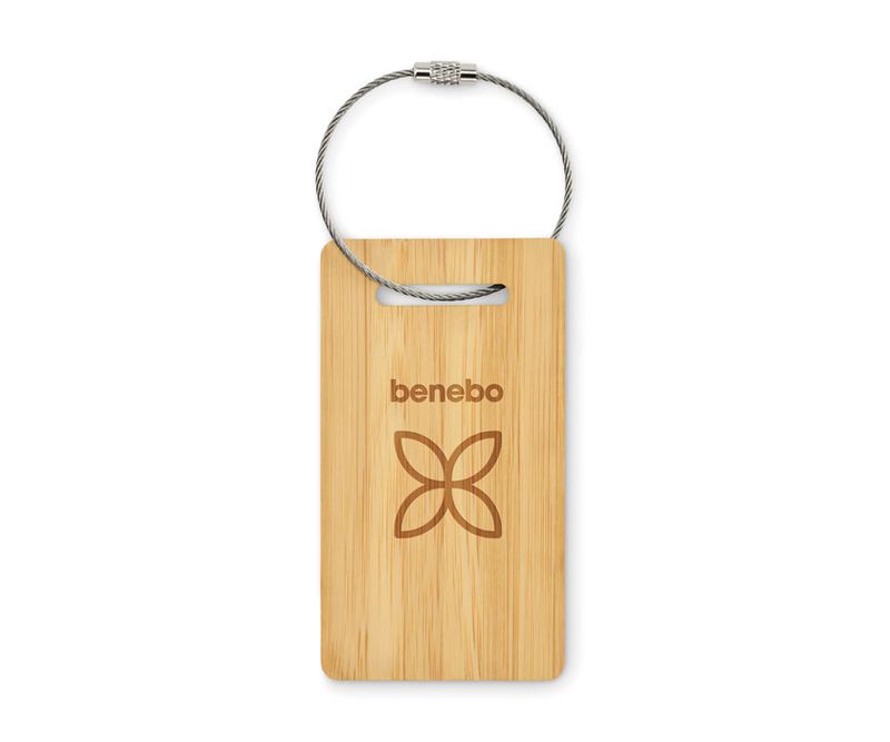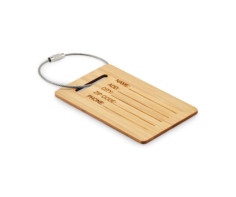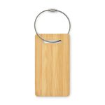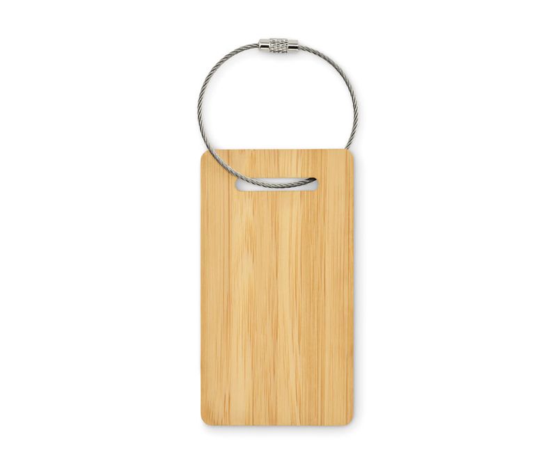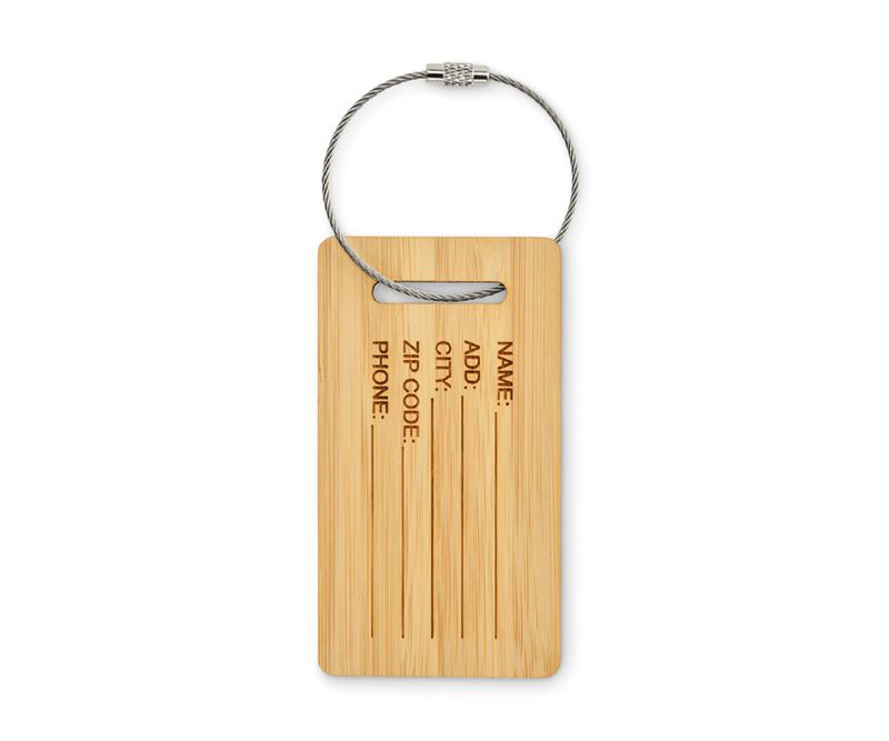 Eticheta pentru bagaje din bambus cu inel din otel inoxidabil.