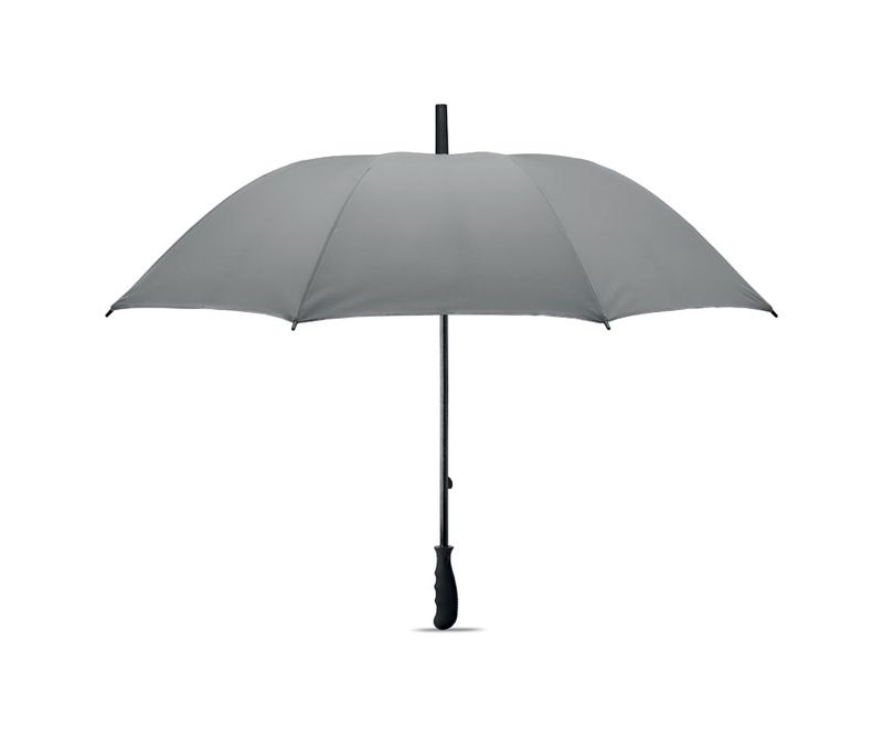 Umbrela de 23 inchi, rezistenta la vant, din polyester puternic reflectorizant, cu ax si nervuri din fibra de sticla. Varf si capete negre din plastic. Maner cauciucat negru. Inchidere manuala.
