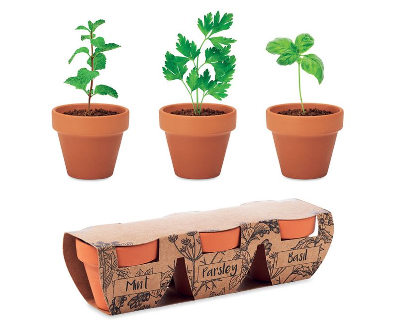 Set 3 vase de lut teracota, include 3 seminte diferite de 3 ierburi diferite: menta, patrunjel si busuioc. Fabricat in UE.