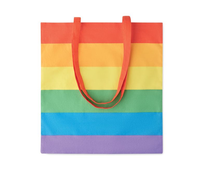 Sacosa de cumparaturi din bumbac de 200 gr/m² cu imprimeu curcubeu si cu manere lungi. Adaugati putina culoare marcii sau mesajului dvs. cu aceasta sacosa de cumparaturi vesela. Aceasta sacosa este ideala pentru cumparaturile zilnice. O puteti transporta de manerele lungi sau o puteti atarna pe umar pentru a a avea mainile libere. Limita de greutate este de 2,5kgs. Acest produs este certificat OEKO-TEX® STANDARD 100.