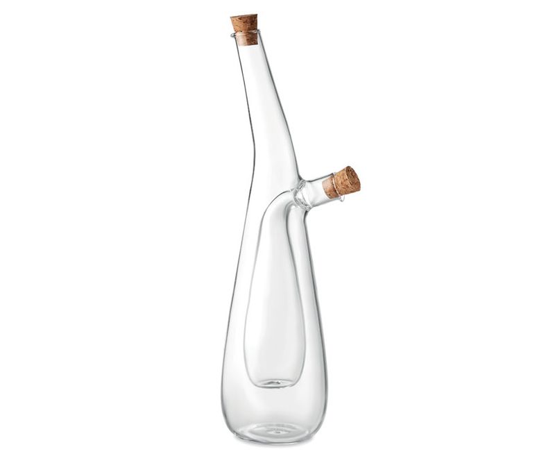 Sticla din sticla borosilicata pentru ulei si otet cu dop de pluta. Capacitate sticla exterioara: 300 ml. Capacitate sticla interioara: 80 ml. Pluta este un material 100% natural. Din cauza naturii sale structurale si a porozitatii suprafetei, rezultatul finalal al personalizarii fiecarui articol poate varia.