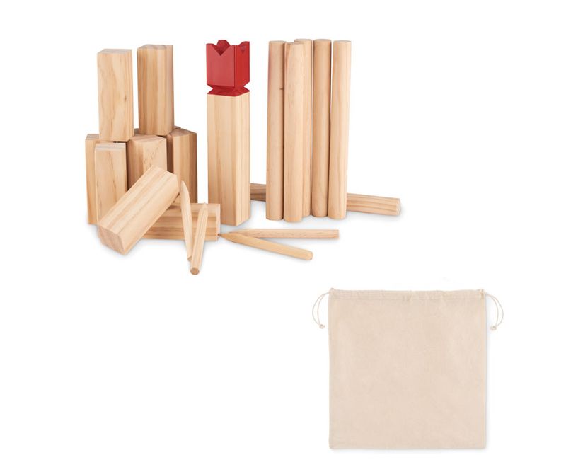 Joc de aruncat, sah viking, din lemn de pin in husa din bumbac cu cordon. Acest joc, de origine suedeza si scandinava, este distractiv pentru copii, familii sau un grup de prieteni si se joaca de obicei in aer liber. Scopul este de a le dobori pe cele mai mari prin aruncarea unor bete de lemn mai mici. Ultima piesa care va fi doborata este piesa din mijloc, regele. Primul care reuseste sa doboare toate piesele inainte ca adversarul sa o faca, castiga. Include 10 turnuri, 4 bete de marcaj, 6 bete de aruncat si 1 rege.