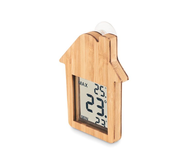 Statie meteo din bambus in forma de casa cu ventuza pe spate. 1 baterie LR44 inclusa. Bambusul este un produs natural, in consecinta pot aparea diferente de culoare, dimensiune sau desen.