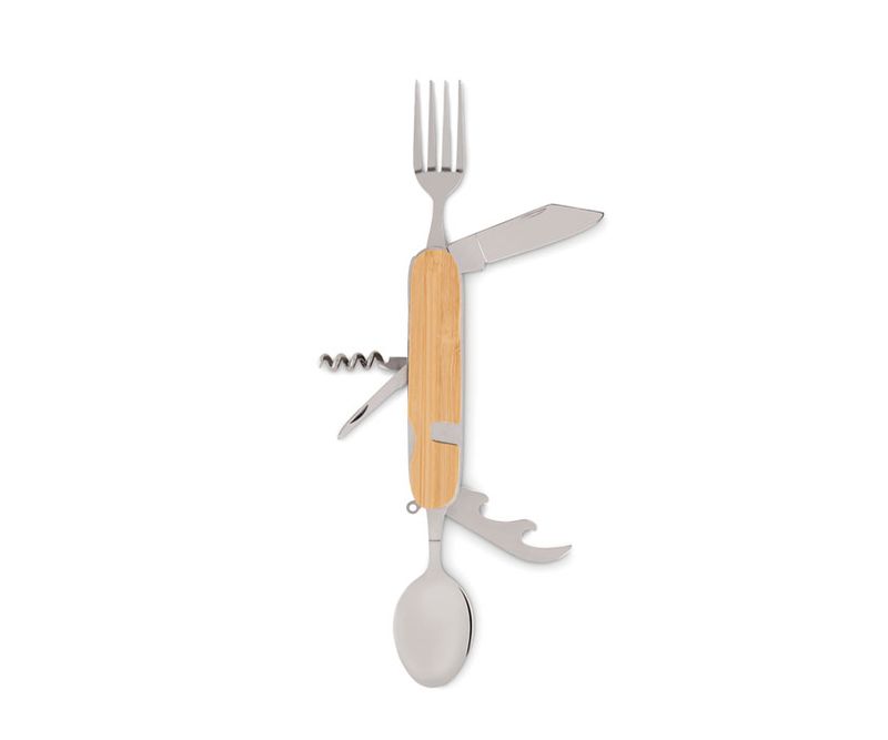 Set de tacamuri de camping pliabile multifunctionale din metal in carcasa de lemn. 5 functii. Include furculita, lingura, desfacator de conserve, tirbuson si cutit. Puteti separa piesele in 2.