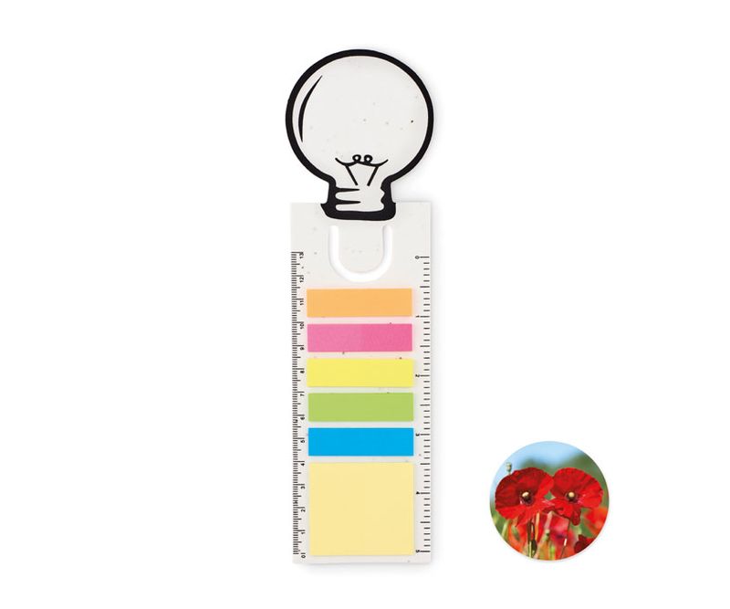 Semn de carte in forma de bec din hartie cu seminte. Memo pad din 2 parti sticky. Bloc de notite lipicioase din hartie reciclata de culoare galbena si markere de pagina cu 5 culori asortate. rigla de 13 cm. Dupa ce v-ati inregistrat gandurile pe ultima foaie, plantati coperta si priviti cum creste intr-un camp frumos de maci rosii.