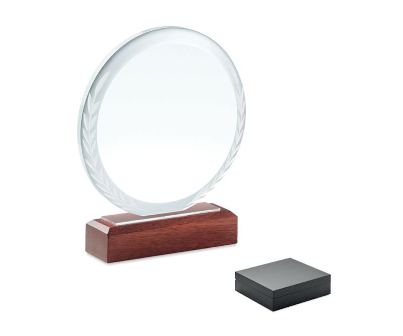 Placheta de premiere sau placa memoriala rotunda pe o baza din lemn de fag, intr-o cutie de cadou.