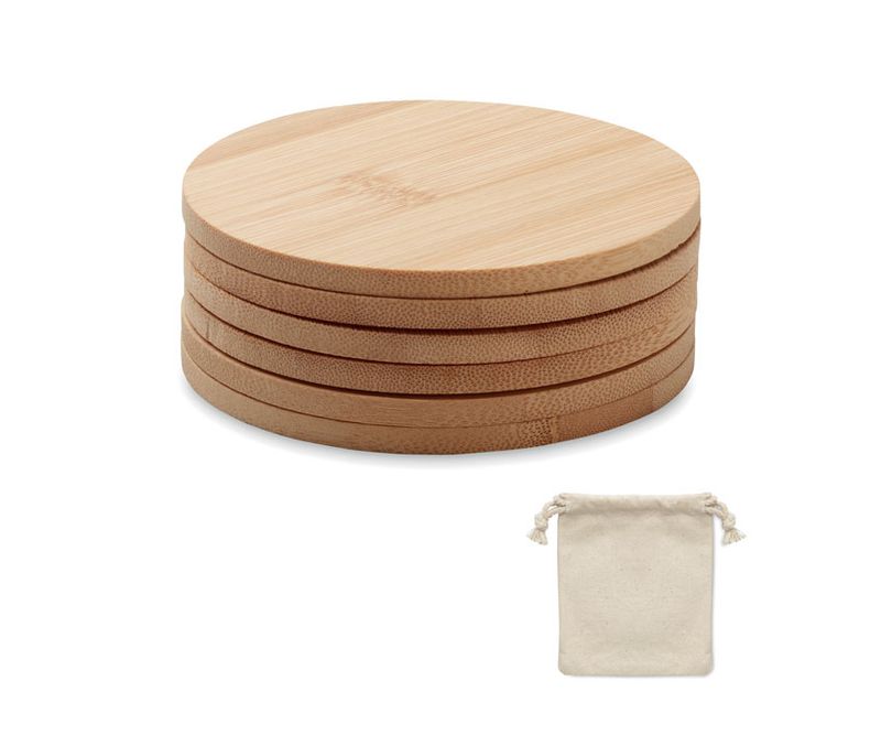 Set de 6 suporturi de pahare rotunde din bambus, prezentate intr-o husa din bumbac cu cordon. Bambusul este un produs natural, in consecinta pot aparea diferente de culoare, dimensiune sau desen.