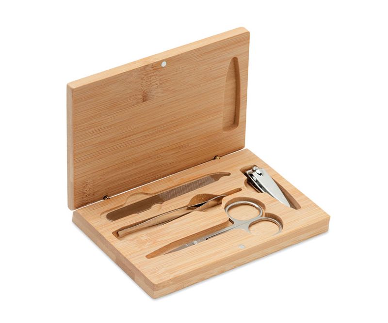 Set de manichiura din 4 piese din otel inoxidabil intr-o cutie din bambus cu inchidere magnetica. Include: unghiera, foarfeca pentru unghii, pila de unghii si penseta. Bambusul este un produs natural, in consecinta pot aparea diferente de culoare, dimensiune sau desen.