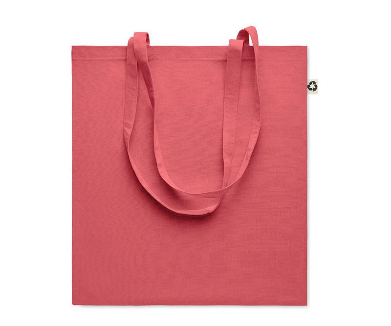 Sacosa de cumparaturi din bumbac reciclat post-consumator (65% bumbac reciclat, 35% bumbac conventional) cu manere lungi. 140 gr/m².