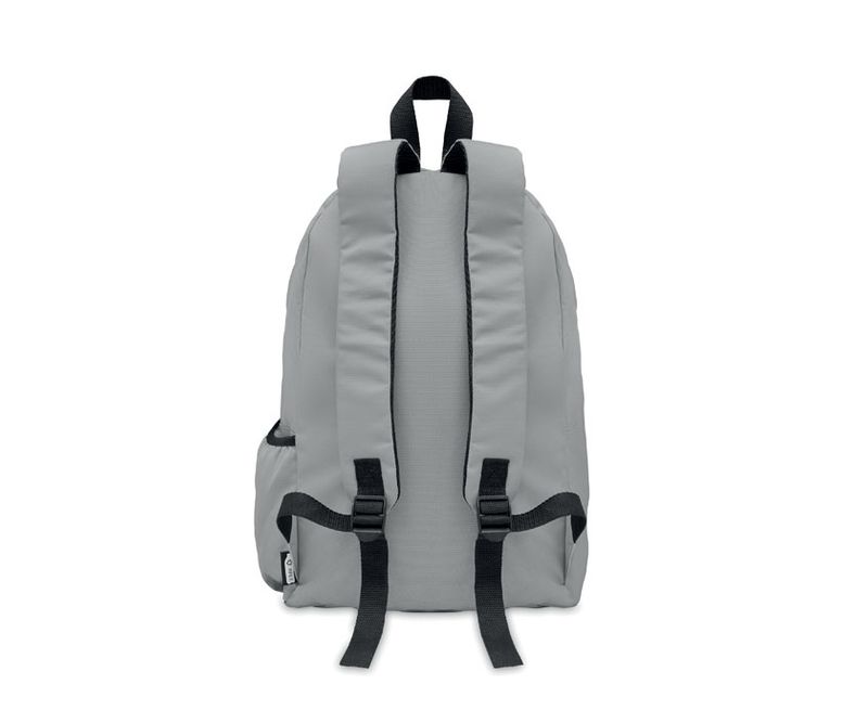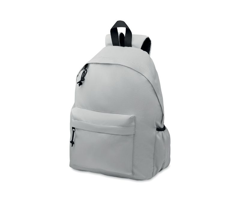 Rucsac din poliester 600D RPET cu buzunar exterior cu fermoar. Spate captusit si compartiment lateral pentru sticle.