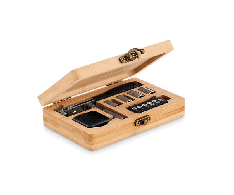 Set unelte din 13 piese prezentat într-o caseta din bambus cu 6 fante în suport: 3 dimensiuni capete surubelnita (4, 5, 6mm), 2 dimensiuni Philips (PH1, PH2) și 1 adaptor, 4 prize (7mm, 8mm, 9mm, 10mm), 1 mâner, 1 conector și 1 ruleta. Bambusul este un produs natural, în consecință pot apărea diferențe de culoare, dimensiune sau desen.