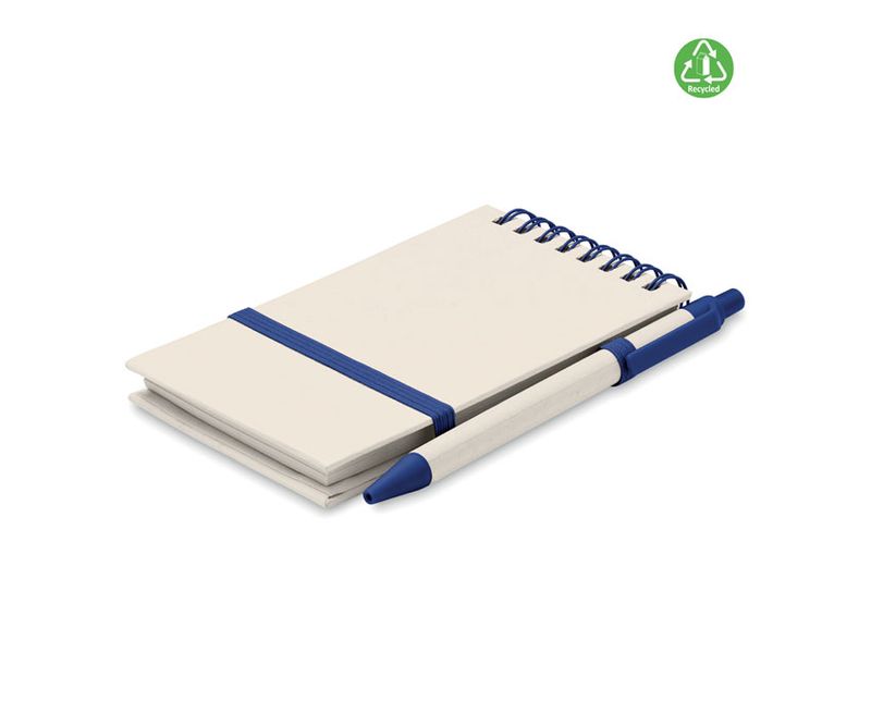 Caiet de notite A6 cu 70 de coli de hartie simpla (carton de lapte reciclat in proportie de 70% si hartie reciclata in proportie de 30%) cu stilou asortat. Legat cu inel. Pix cu bila si buton asortat. Cerneala albastra. Curea de inchidere elastica si suport pentru stilou.